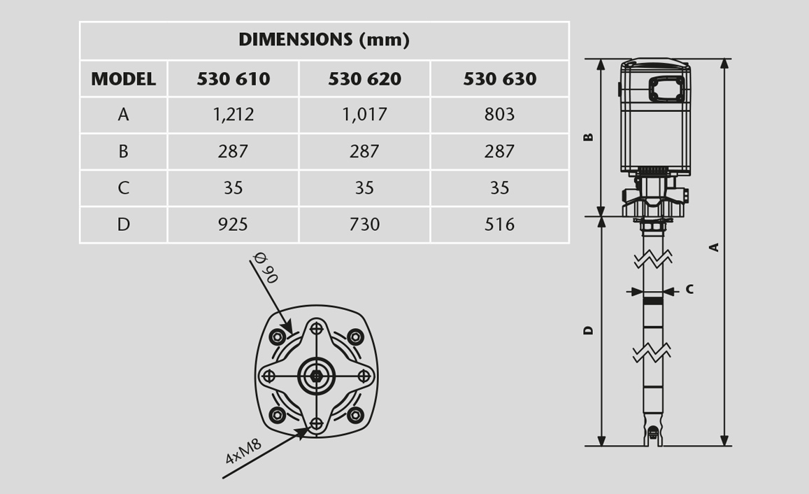 | 530 610 | 185 kg (400 lb) drum | 925 mm | 1,212 mm | 11 kg |