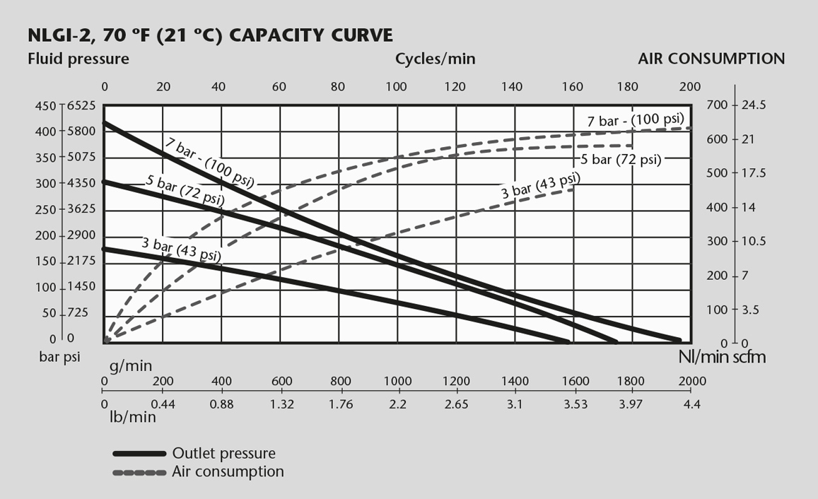 - Air consumption at 5 bar (70 psi) air pressure, NLGI-2 grease at 20 ºC (68 ºF) and 80 cpm.
