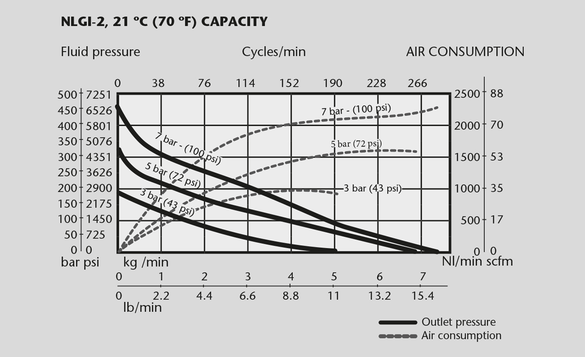 - Air consumption at 5 bar (70 psi) air pressure, NLGI-2 grease at 20 ºC (68 ºF) and 80 cpm.