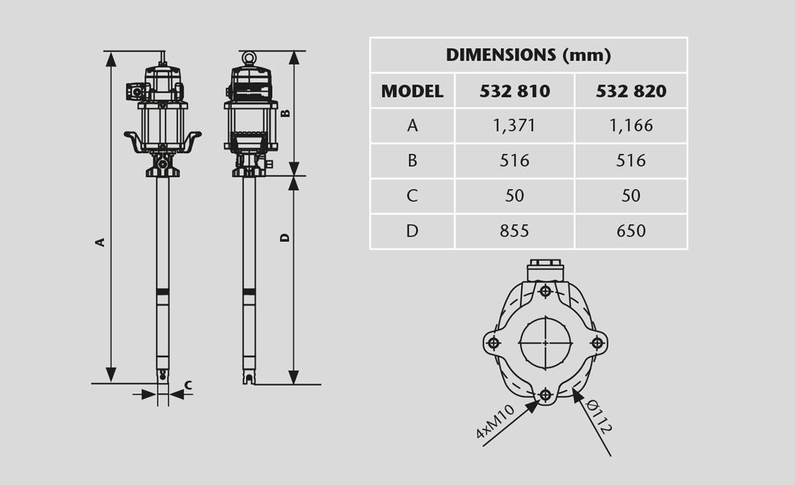 | 532 810 | 185 kg (400 lb) drum | 855 mm | 1,371 mm | 27 kg |