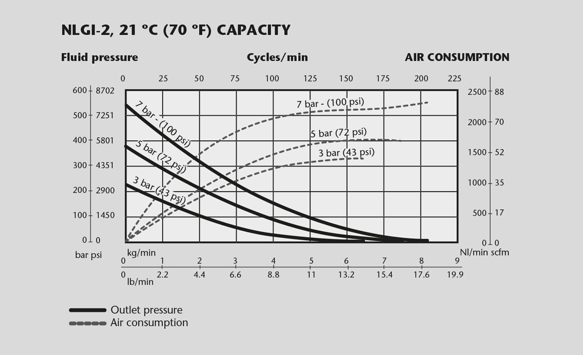 - Air consumption at 5 bar (70 psi) air pressure, NLGI-2 grease at 20 ºC (68 ºF) and 60 cpm.