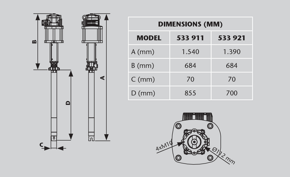 | 533 911 | 185 kg (400 lb) drum. NPT connection. | 855 mm | 1,539 mm | 59 kg |