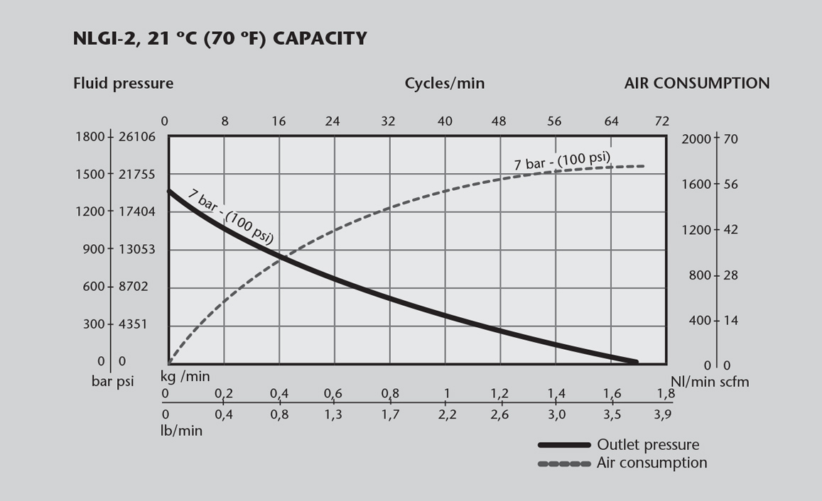 - Air consumption at 5 bar (70 psi) air pressure, NLGI-2 grease at 20 ºC (68 ºF) and 40 cpm.