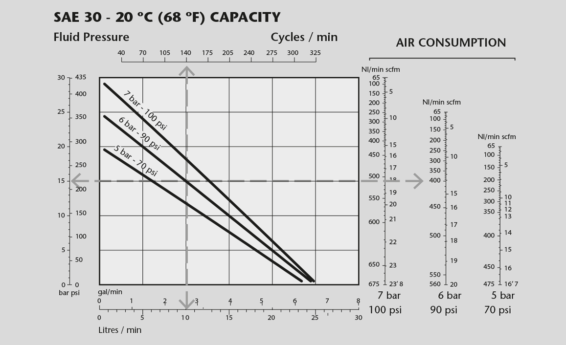 | Delivery at 85 cycles/min. | 10 l/min (2.7 US gal/min) |