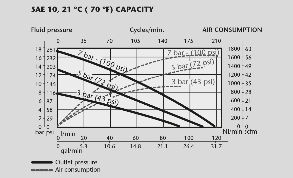 - Maximum air consumption with 5 bar air inlet pressure and 80 cycles/min.