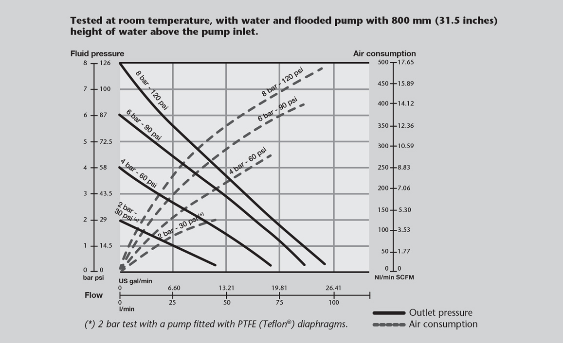 - Data measured with water, air inlet pressure 7 bar (100 psi), 20 ºC (68 ºF).