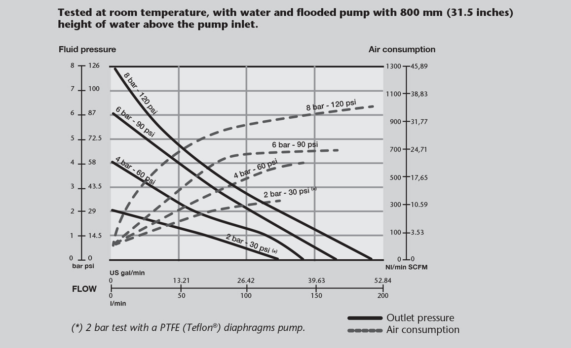 - Data measured with water, air inlet pressure 7 bar (100 psi), 20 ºC (68 ºF).