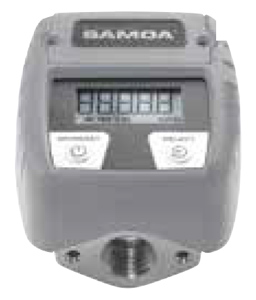 Oval gear meters for use as in-line meters with oil, DEF / AdBlue®, windshield wash solution or antifreeze solution, depending on the meter wetted materials. They can be wall mounted in the fluid line or at the pump outlet. Meters include an electronic register controlled by wetted magnets and powered with two AAA alkaline batteries. It is shock proof and isolated from the fluid handled. Meter display is multi-function, showing the volume dispensed per delivery, and has a permanent and a resettable (trip function) totalizers. The display can be programmed to show delivery in litres, quarts, pints and US gallons. The assembly is enclosed in TPE moulded shroud.