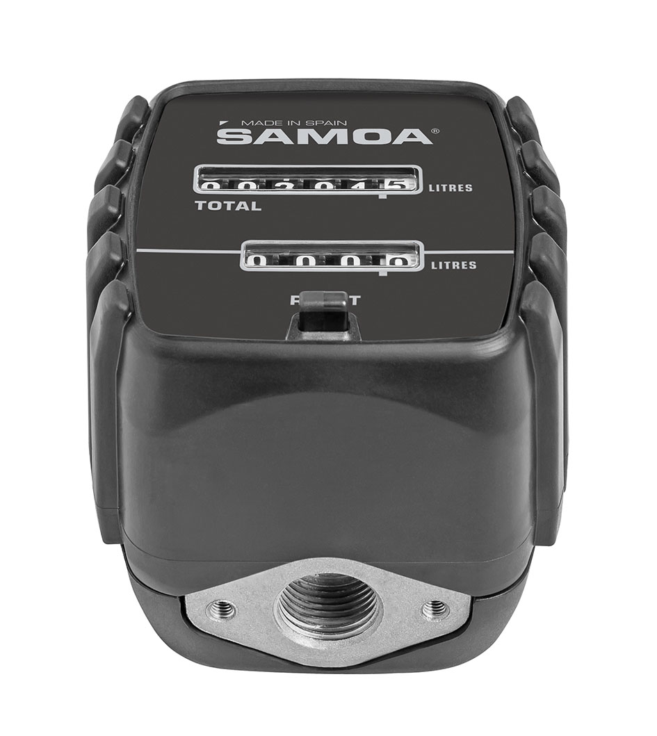 Oval gear meter with mechanical odometer style register for use with lubricants up to SAE 140. Resettable partial reading up to 999.9 litres and non-resettable totalizer. Meters are factory calibrated for maximum accuracy and include protective rubber shroud.