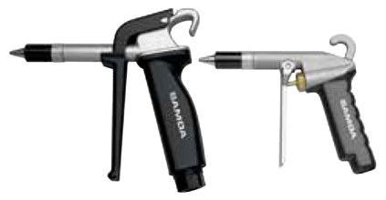 Aluminium blow guns with anti-slide grip. High air flow and wide range of accessories. Maximum minimum pressure: 3 to 8 bar, connection thread: 1/4" BSP (F). Includes extra-quite nozzle.